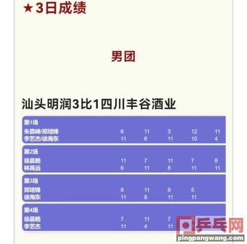 虽然0比3不敌山东鲁能,但是四川丰谷酒业在上午场比赛给汕头明润制造了不小的麻烦。首盘朱霖峰/郑培锋在1比2落后的局面下逆转李艺杰/徐海东,第二盘徐晨皓苦战5局输给了林高远,这一盘也成为了比赛转折点,之后郑培锋1比3不敌徐海东,徐晨皓又在第四盘输给了李艺杰,汕头明润有惊无险地拿下了最终胜利。晚间比赛,汕头明润没有再遭遇险境,他们直落三盘战胜了江苏中超电缆·华宾。