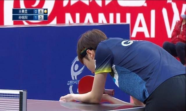 第二局,王曼昱依然坚持提升反手位质量,积极向孙铭阳施压,不让孙铭阳在速度上占得先机。第二局,孙铭阳凭借发球直接拿下两分,并且频频吃到发球局。11:4王曼昱扳回一城。