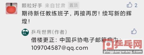 细心的球友发现,中国乒协的这则通知里出现了一个非常明显的错误,即公布的邮箱,“qq.com”写成了“gg.com”。有人看了也许会说,也许乒协用的不是QQ邮箱……笔者要说的是:非也!因为此前乒协发的通知里,邮箱就是109704587@qq.com,这次明显是出错了。对此,中国乒协主办的《乒乓世界》杂志在公号的留言处也进行了更正: