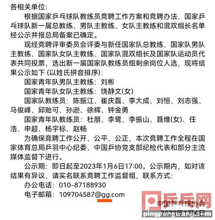 1月4日上午,中国乒协在其官网上正式公布了新一届教练组20人名单的竞聘公告,同时宣布,“新一届总教练(李隼)、男队主教练(王皓)、女队主教练(马琳)和混双组长(肖战)名单经公示并报总局备案已确定?!?p>