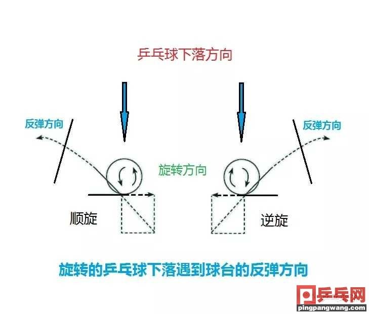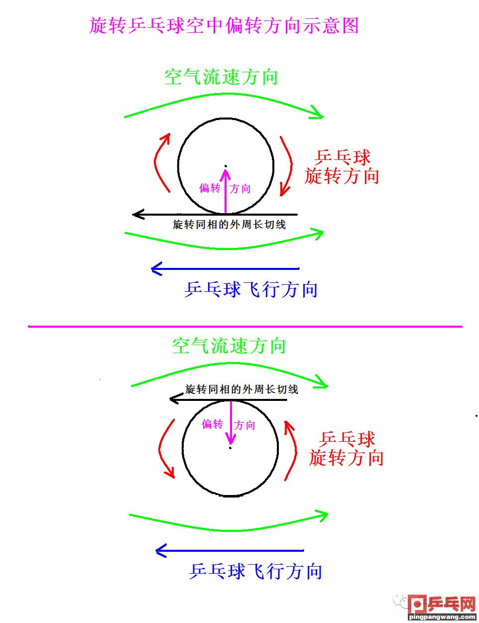 一、乒乓球与球拍或球台相互作用这是牛顿第三定律,作用力与反作用力的实际应用。为突出旋转,这里只讨论乒乓球垂直落下的情况。当乒乓球没有旋转直接碰撞(作用力)到球拍或球台上,那么就会得到一个反弹力(反作用力)。当乒乓球加上旋转时,同样球拍或球台会给乒乓球一个反向旋转的反作用力,乒乓球反弹会沿着自身旋转相反的方向飞出。仔细体会一下,就能总结出“旋转的乒乓球接触到球拍或球台时,会沿旋转的反方向弹出?!蔽蘼凵闲?、下旋、左侧旋、右侧旋都是一样的道理。当然还有一种特殊xuejiazl.org情况,那就是遇到长胶时旋转的乒乓球在长胶球拍上“打滑”。长胶球拍没有给乒乓球旋转的反作用力,那么反弹方向会和上述情况相反。不过,现阶段不用考虑长胶这种特殊情况,以免弄混记忆。二、乒乓球在空中飞行过程中与空气相互作用爱好者在打球时会发现乒乓球在空中飞行的轨迹很神奇,有些时候飞得很平很稳,有些时候突然下扎,还有些时候会出现忽左忽右的“香蕉球”。这时候就用到了伯努利定理,流体的压力问题。乒乓球如果不旋转,那么在飞行过程中周围的空气流速是一样的。乒乓运动人生xuejiazl.org球的飞行轨迹就是抛物线。一旦乒乓球加上旋转,将导致旋转两侧的空气流速出现快慢的偏差。流速大的地方压强较小,流速小的地方压强较大,所以乒乓球会由压强大的地方向压强小的地方移动,从而产生位移。上旋球的下方流速大压强较小,上方流速小压强较大,给乒乓球一个向下的力,所以上旋球的弧线下扎明显。下旋球的下方流速小压强较大,上方流速大压强较小,给乒乓球一个向上的力,所以下旋球的弧线很平稳,会飞行得很远。左右旋转球出现“香蕉球”飞行弧线也是这个道理,是两侧的空气流速和压强导致的。上面说的理解起来容易,但想记住并应用到实战中有点绕道。可以简单总结一下,乒乓球在飞行过程中,空气流速肯定是与飞行方向相反的,我们只需要考虑乒乓球的旋转既可判断出球飞行偏转的方向。仔细体会一下,就能总结出“旋转中的乒乓球与飞行同向的外周长切线垂直到圆心的线段,为乒乓球实际的偏转方向?!薄缎古仪蚩罩衅较蚴疽馔肌犯隽瞬煌?font hidden='hidden'>运动人生www.wgqpnmx.cn旋转情况的偏转示意,可以看成是上旋、下旋或左侧旋、右侧旋。总结一下:1、旋转乒乓球与球拍或球台相互作用:旋转的乒乓球接触到球拍或球台时,会沿旋转的反方向弹出。2、旋转乒乓球在空中飞行过程中与空气相互作用:旋转中的乒乓球与飞行同向的外周长切线垂直到圆心的线段,为乒乓球实际的偏转方向。