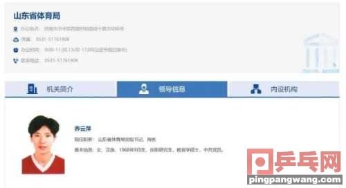 1月29日,山东省政府官网“山东省体育局领导信息”中更新显示,前乒乓球世界冠军、曾任山东省体育局党组副书记和山东省体育总会专职常务副主席的乔云萍,已经担任山东省体育局党组书记、局长。此前,山东省委组织部曾于1月6日公示,乔云萍“拟进一步使用”。运动人生www.wgqpnmx.cn
