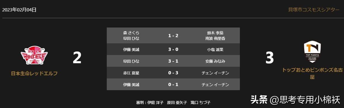 北京时间2023年2月4日,日本乒乓球T联赛重燃战火,伊藤美诚和早田希娜坐镇的日本生命俱乐部2-3不敌郑怡静领衔的名古屋,爆出了大冷门。早田希娜在双打比赛中意外丢分,虽然她和伊藤美诚都赢下了单打比赛,但是伊藤美诚在决胜场遭到绝杀,以9-11输给郑怡静,导致球队意外输球。之前,日本乒乓球T联赛为全日本乒乓球锦标赛让路,整个联赛暂停了一段时间。重燃战火之后,伊藤美诚和早田希娜联手出战,两人都在日本生命俱乐部效力,但是状态大不相同。早田希娜在之前的全日本锦标赛加冕三冠王,创造了诸多新历史,伊藤美诚再遭打击,女单无缘八强,在奥运选拔赛积分榜上处于落后状态,形势非常不利。伊藤美诚需要更多比赛来恢复手感,所以在联赛重启之后,伊藤美诚第一时间参赛。日本生命俱乐部拥有伊藤美诚、早田希娜,当然是夺冠大热门,但是面对名古屋,日本生命俱乐部却爆冷输球。作为国乒的两大劲敌,早田希娜和伊藤美诚都丢分了,从比赛过程看,两人都比较疲惫,需要好好调整。第一盘双打比赛,早田希娜搭档森樱守,结果以1-2不敌铃木李茄/南波侑里香。随后,伊藤美诚登场,她在第一局轰出11-1,最终以11-1、11-7、11-7连赢三局,横扫小盐遥菜。第三盘,早田希娜再次登场,她以3-1击败安藤南,帮助日本生命俱乐部反超比分。可惜,日本生命俱乐部没有把握住机会,第四盘登场的赤江夏星以0-3惨败郑怡静。决胜盘采用一局定胜负的方式,日本生命俱www.xuejiazl.org乐部派出了伊藤美诚,名古屋继续信任郑怡静。结果,伊藤美诚在7-4领先的情况下错失机会,以9-11输给郑怡静。随着伊藤美诚惨遭绝杀,日本生命俱乐部以2-3爆冷输球。名古屋意外获胜,头号功臣就是郑怡静,她独得2分,率队力挽狂澜。同一时间还进行了一场男团比赛,田添响/森园政崇2-1击败上田仁/五十岚史弥,丹羽孝希在0-2落后的情况xuejiazl.org下连扳三局,以3-2逆转曾根翔,国乒名将郝帅3-1击败松平健太,冈山以3-0锁定胜局。虽然第四盘登场的森园政崇以0-3输给英田理志,但是冈山还是以3-1击败TT彩玉俱乐部,收获一场重要的胜利!