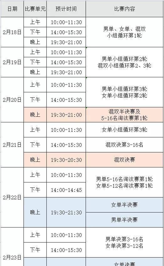 如前所述,混双资格赛第一阶段的比赛从2月16日开始,而直通赛的正赛要到2月18日才能进行。小组赛第一轮将在第一天进行。而接下来的男单第二轮,混双第二轮和第三轮开始www.xuejiazl.org,2月20日继续单打组循环赛,而混双则进入半决赛和资格赛阶段。