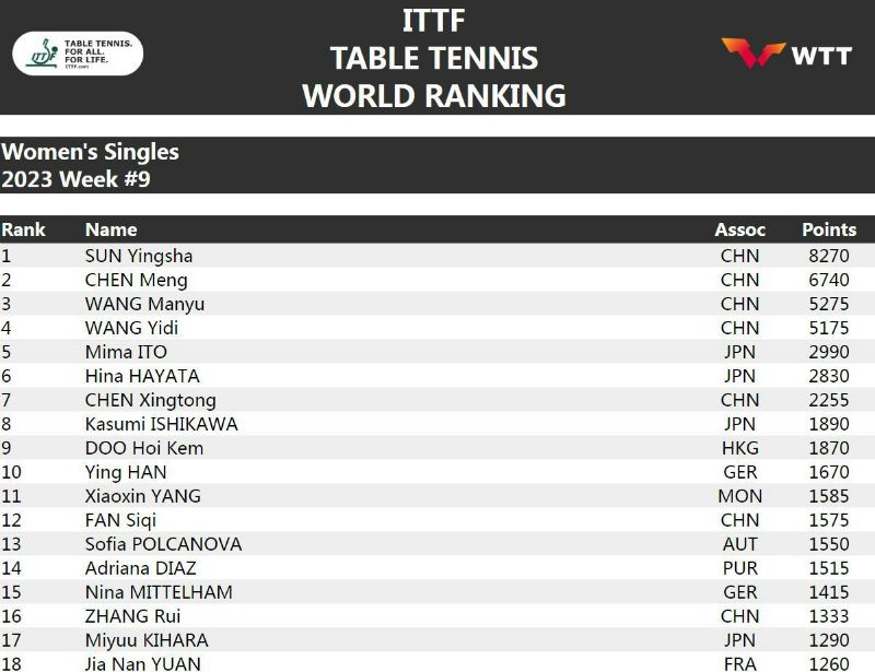 2023年国际乒联最新世界排名第9周 中国乒乓球男女单打世