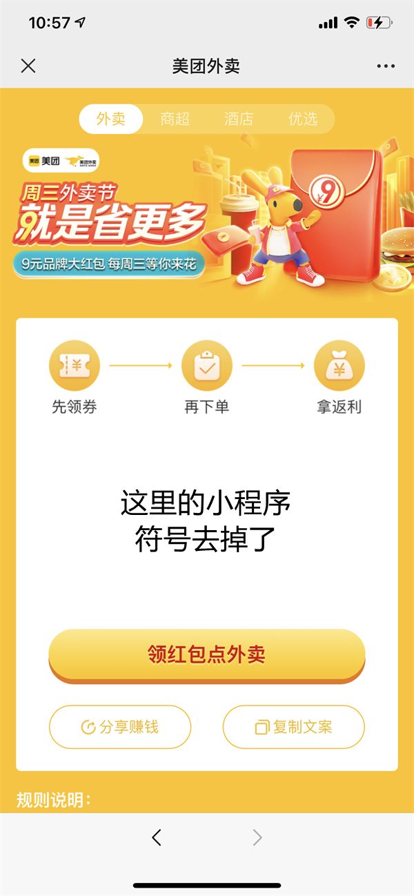要实现点外卖省钱,我们主要也是通过外卖公众号、外卖小程序及一些返利APP来实现的,那我主要用的就是这个,“大家看我,看我,再看我,就帮你省钱了”。