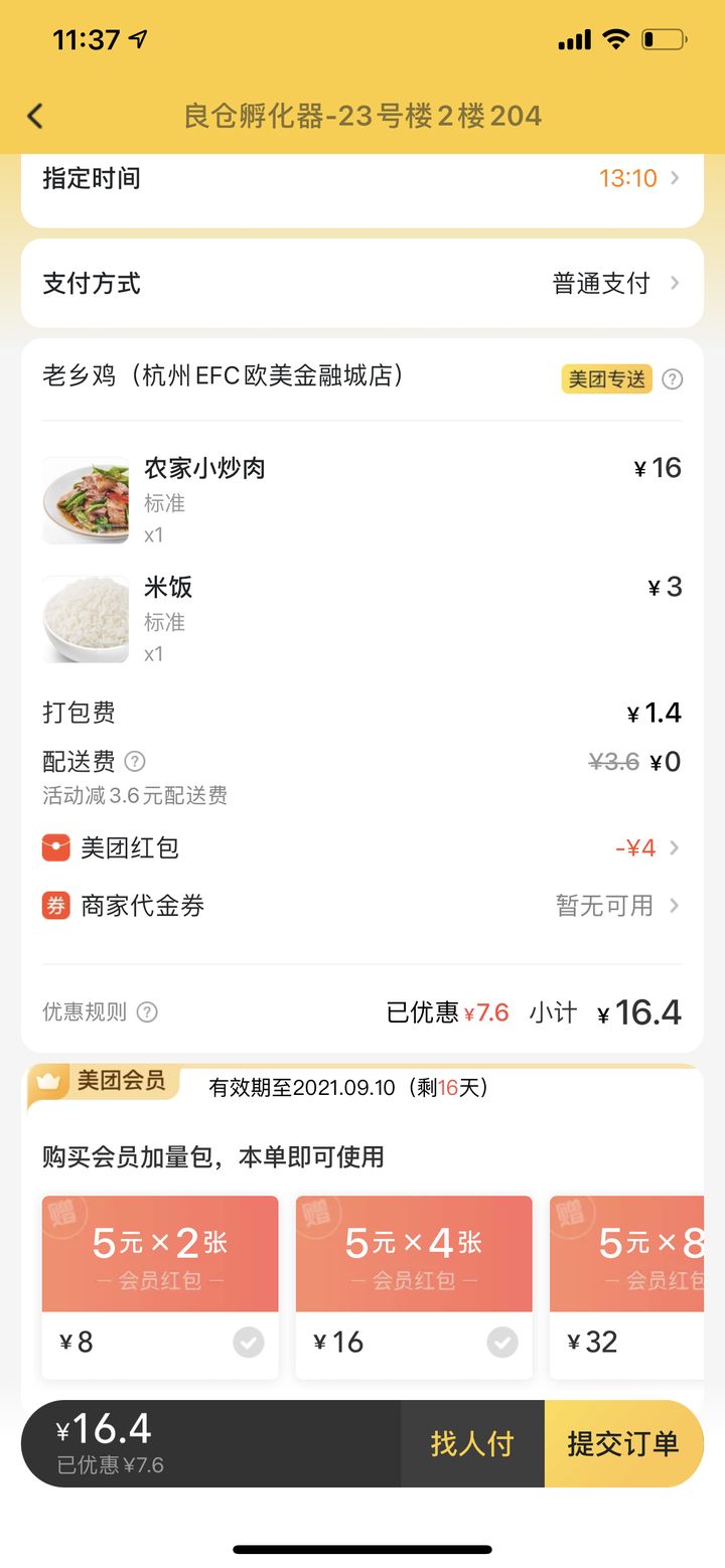 是不是一单就省了8.6米,如果你1天2餐,是不是可以省15米多,还有一个方法,一般你点了外卖,会有扫码加微信然后你评价之后,会给你减3-5元,你看一下,我16.4米点的外卖,结果还减了4元,如图: